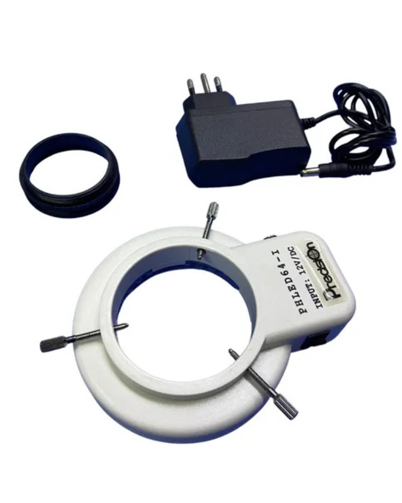 O Iluminador Circular/Anelar de LED contendo 64 LEDS inclui um anel de luz LED, um adaptador de alimentação 110-240V e um adaptador de montagem do anel.